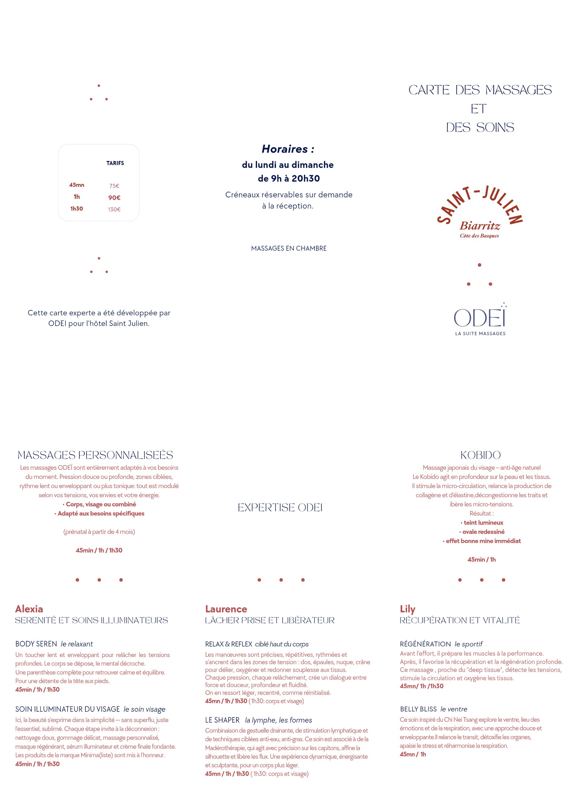 Located in the center of Biarritz, just steps away from the famous Biarritz beach on the Côte Basque, the Hôtel Saint-Julien offers a unique wellness concept, combining high-quality treatments with a serene atmosphere created for deep relaxation and comfort. This establishment provides a wide range of relaxing, light and relax-focused massage types, performed by a team of experienced professionals, with easy access for all visitors.